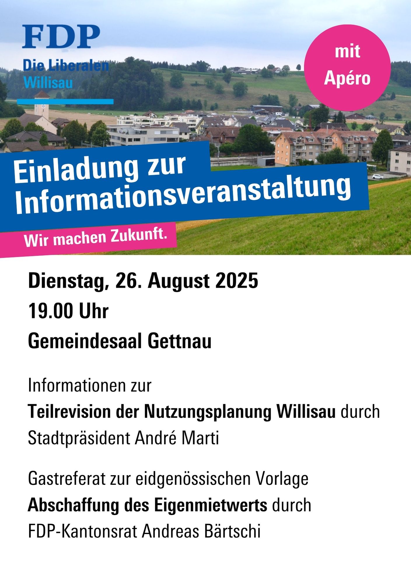 Die FDP Willisau durfte am Dienstag, 26. August 2025, rund 25 interessierte Personen zur Informationsveranstaltung im Gemeindesaal Gettnau begrüssen. Präsident Christian Waltenspül eröffnete den Abend und führte durch das Programm.