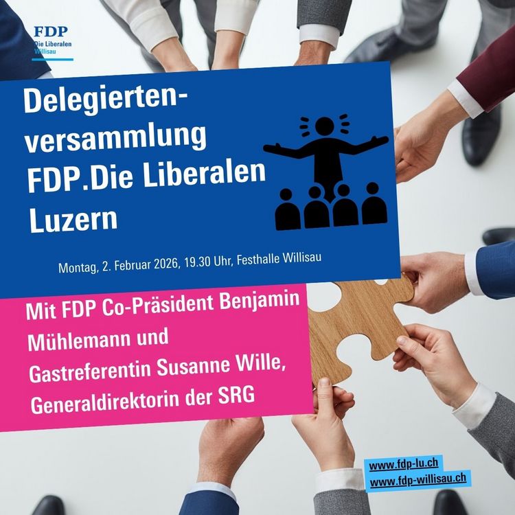 Delegiertenversammlung FDP.Die Liberalen Luzern Mit FDP Co-Präsident Benjamin Mühlemann und Gastreferentin Susanne Wille, Generaldirektorin der SRG Montag, 2. Februar 2026, 19.30 Uhr, Festhalle Willisau Ab 18.00 Uhr bis Veranstaltungsbeginn und in der Pause gibt es Risotto, Sandwiches, Süssgebäck und Getränke.